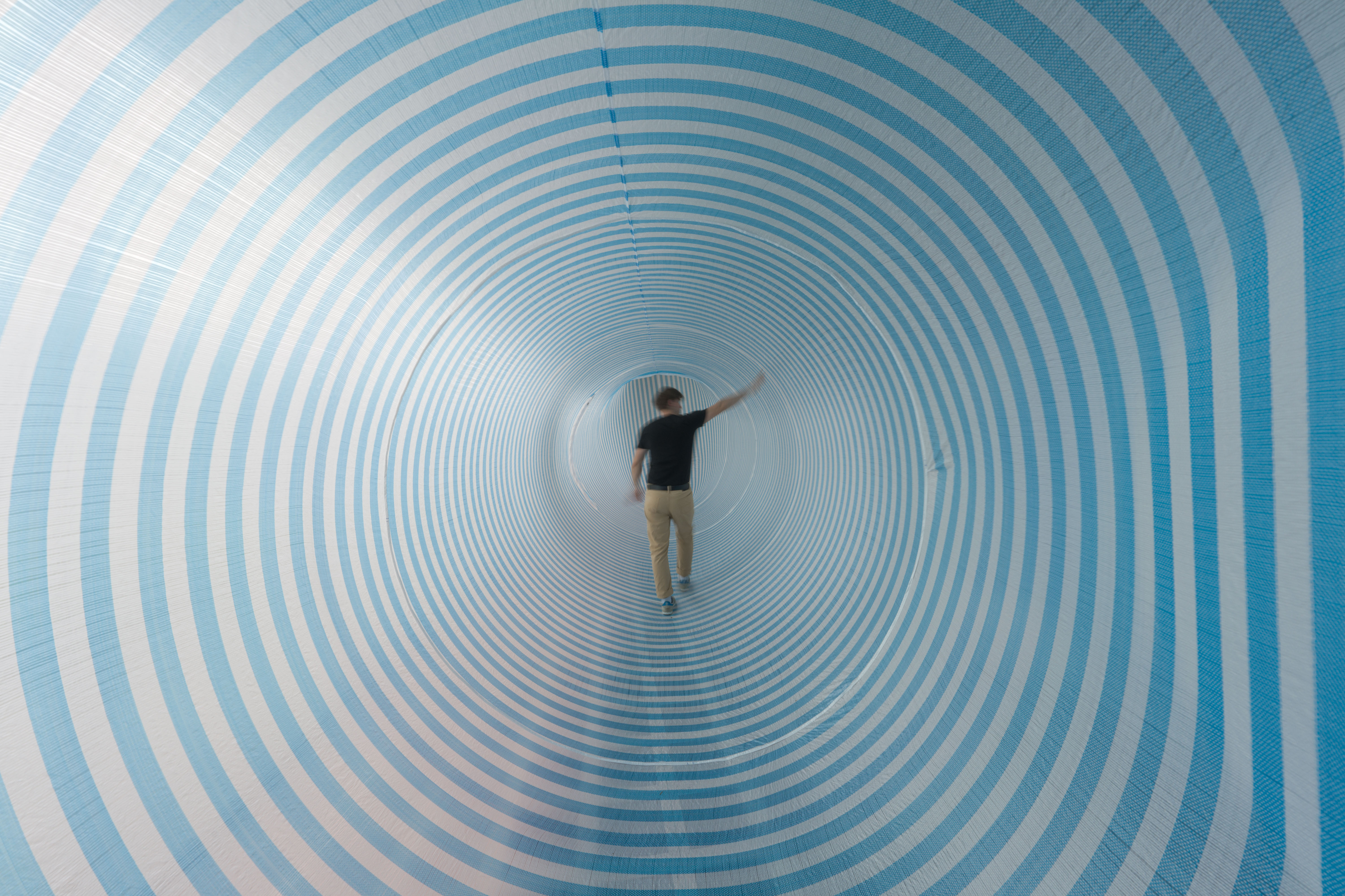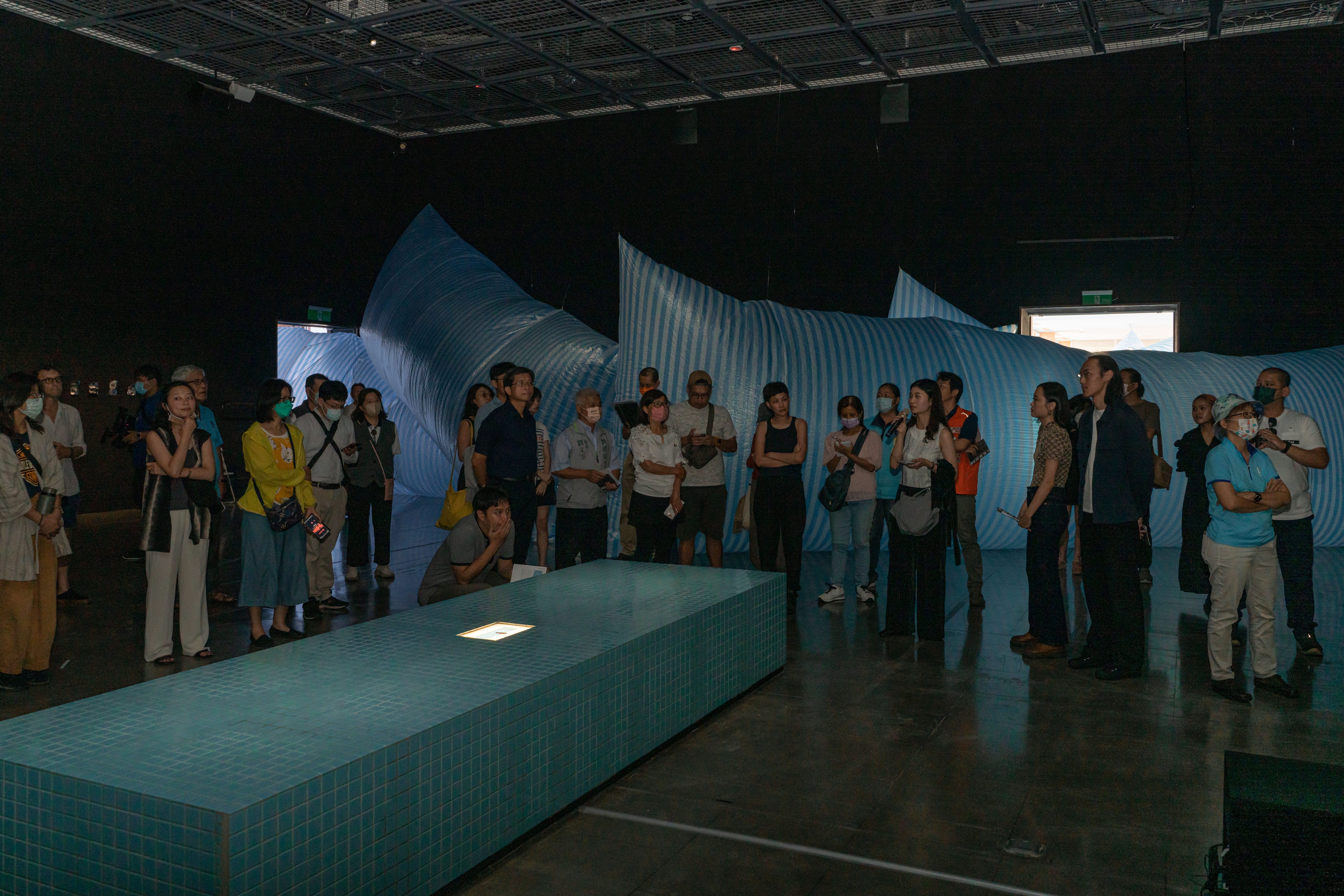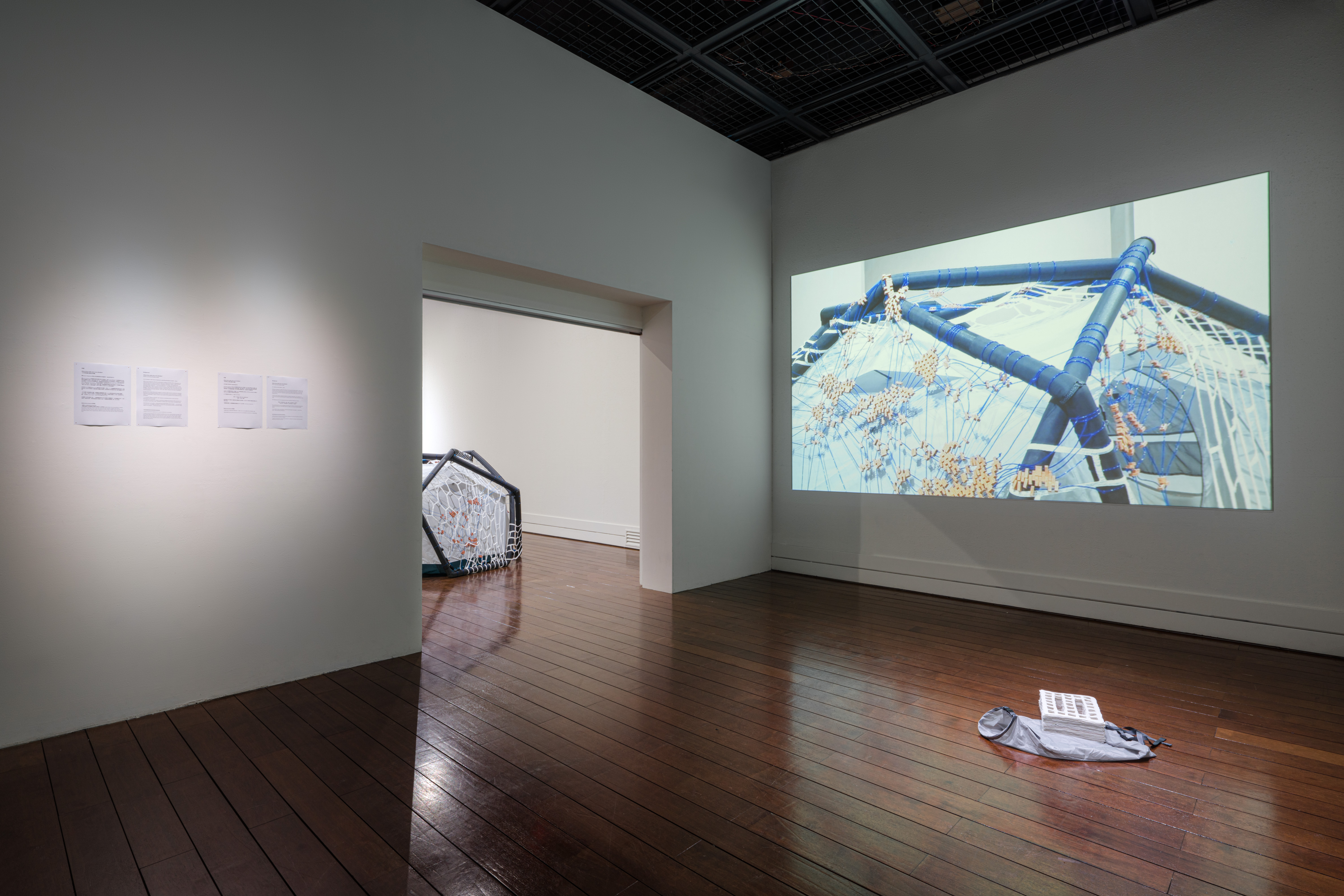 黃子儇在台灣生活期間,觀察城市景觀經常出現的工業帆布,那些常用於修被復和建築建造之用,或是作為防護及阻隔粉塵的材料,經由翻轉藍白帆布創造出具有臨時性空間(temporary space)概念的空間,暫時地和美術館空間產生出一種施工中,臨時且變動的體驗。展出的現地製作作品《Rebase#12 – Decision》延伸《Rebase – 再基地》系列,邀請觀眾從展覽的入口,跨越作品或是直接進入到作品空間中體驗,由此建構出多層次的空間並開發出新的感知場域。