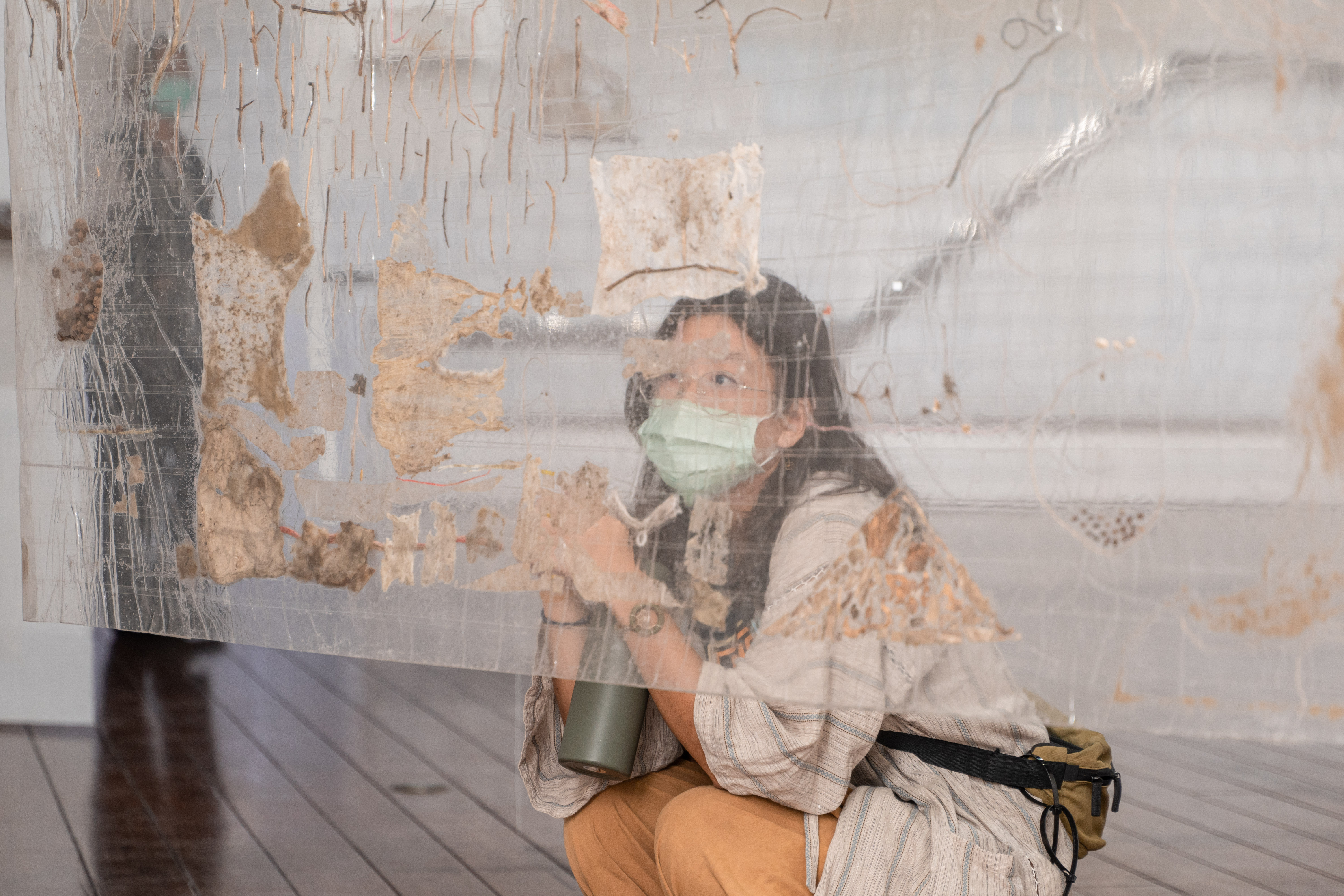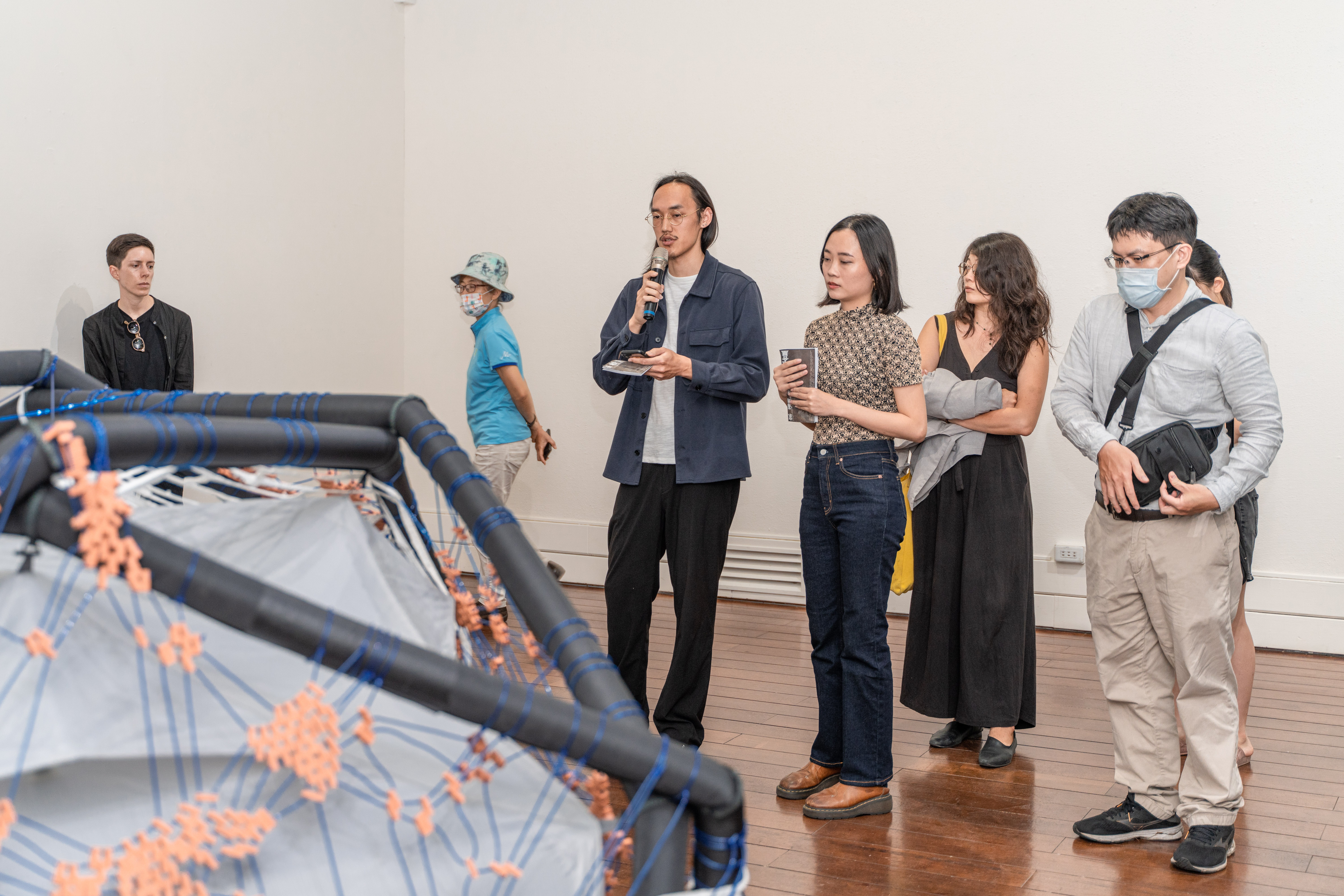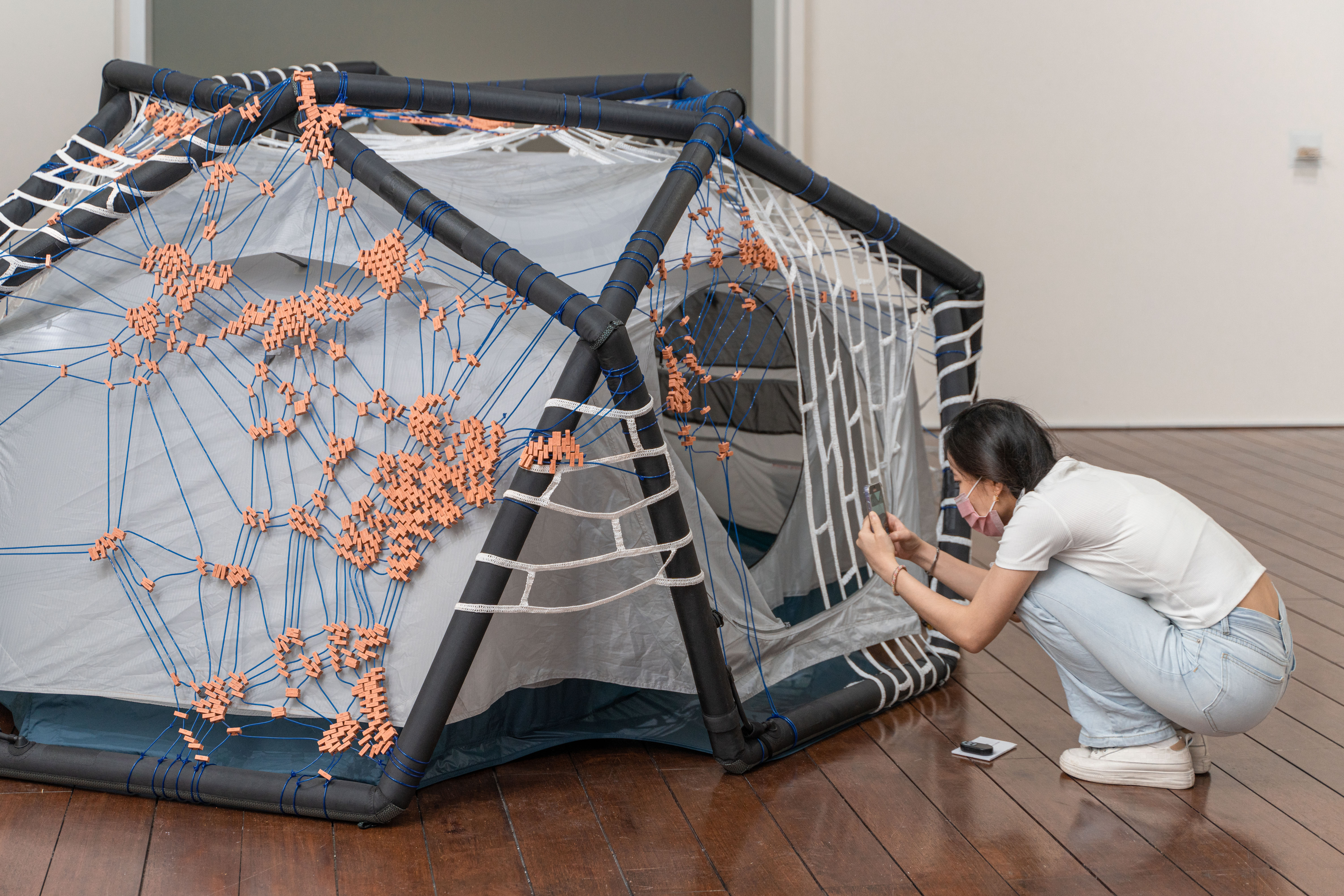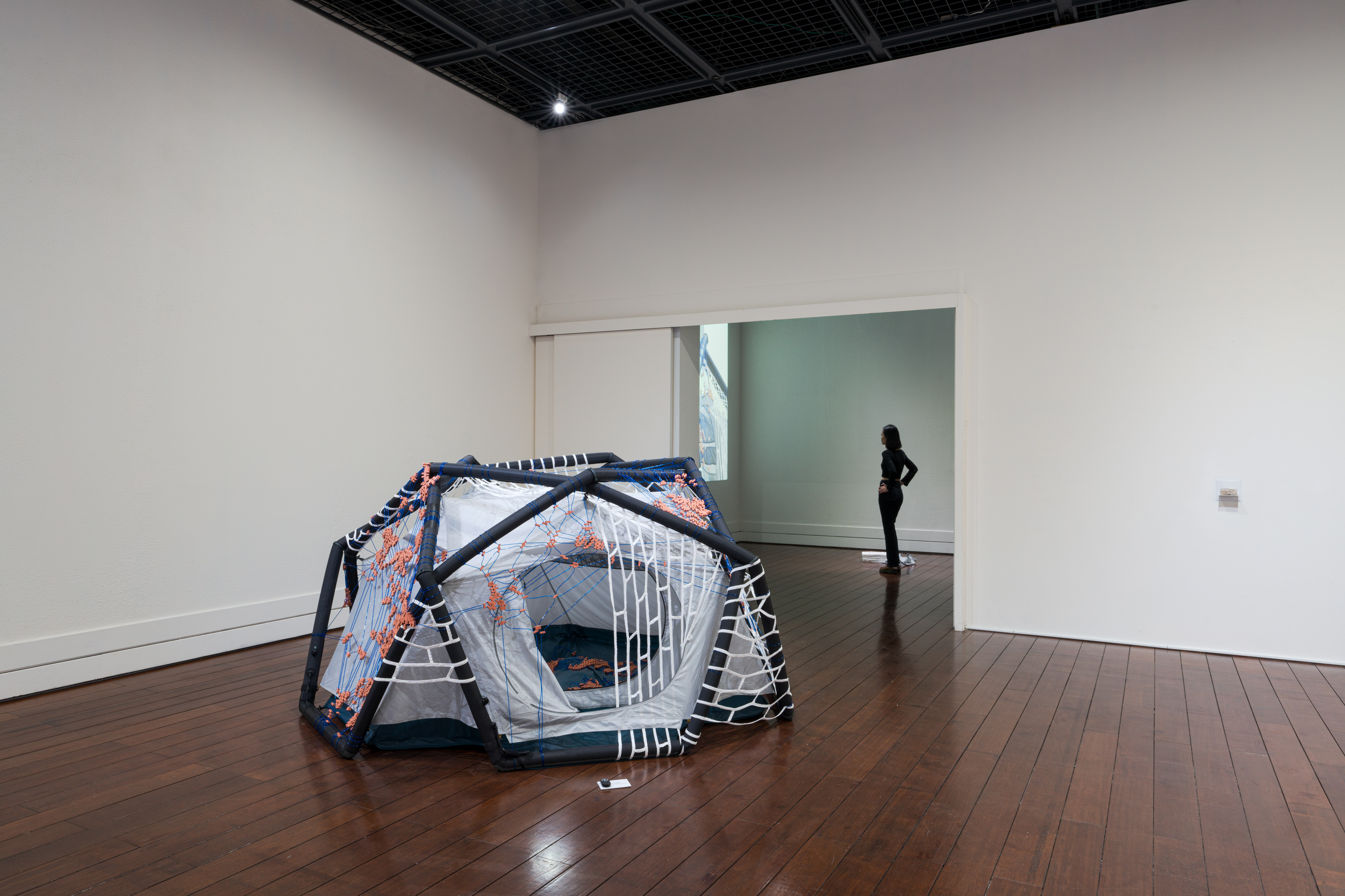 《Supporting Structures – A social fabric》嘗試探討移民、居住與政治權利等議題,作品包含了一組動力裝置、錄像和詢問美術館為廣場外的跳舞的群眾延長熄燈的書信文件。於臺東美術館駐村期間的現地製作裝置作品。由棉繩和小瓦片編織成的帳篷,是藝術家收集了在國際間不同城市舉辦工作坊時,邀請當地觀眾集體鉤織而成的。作品所建構隱喻社會與集體性的臨時空間,藝術家提出我們該如何重新組織社會結構?又該如何採取集體行動?並以此思考如何創造出不同群體間對話的情境。