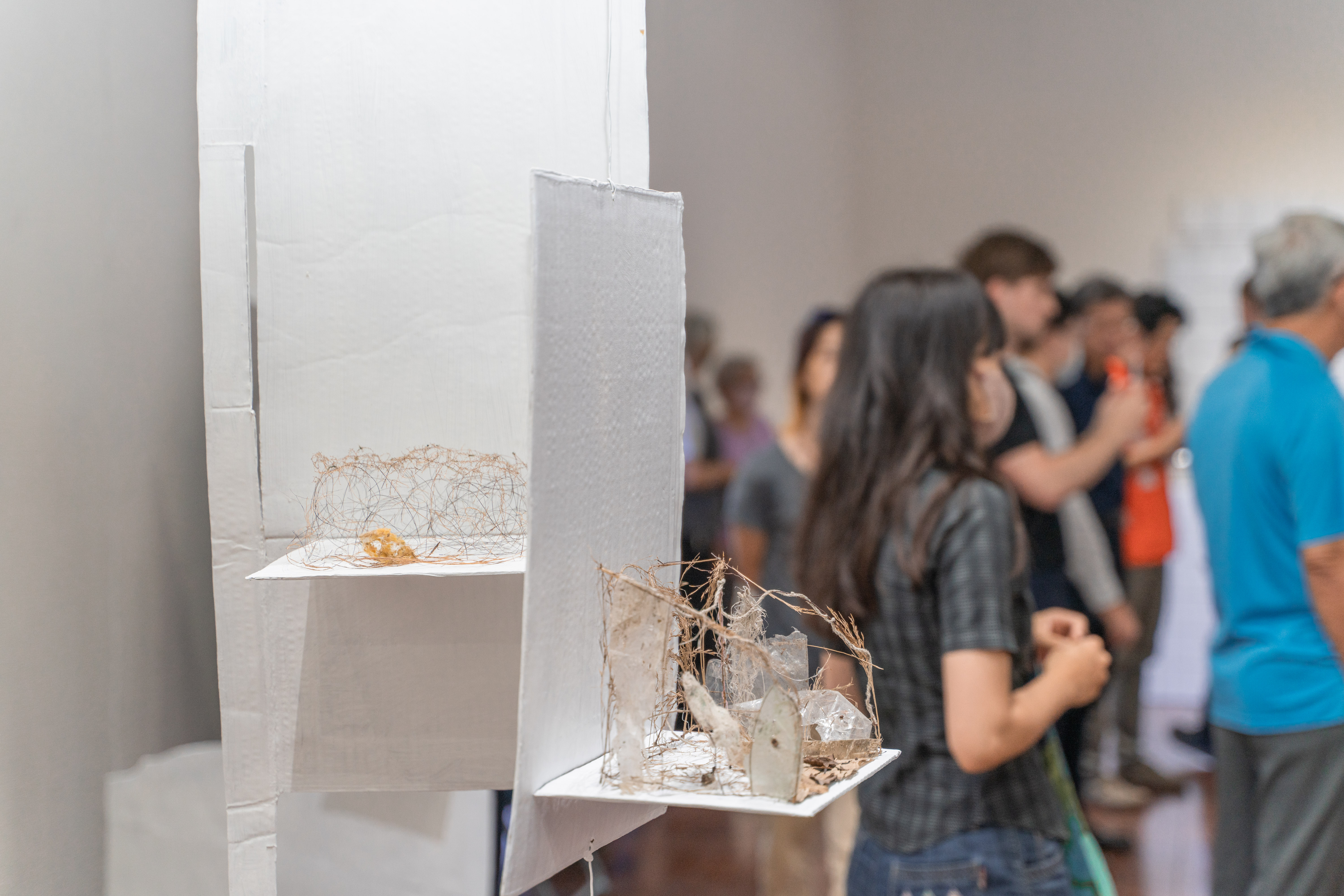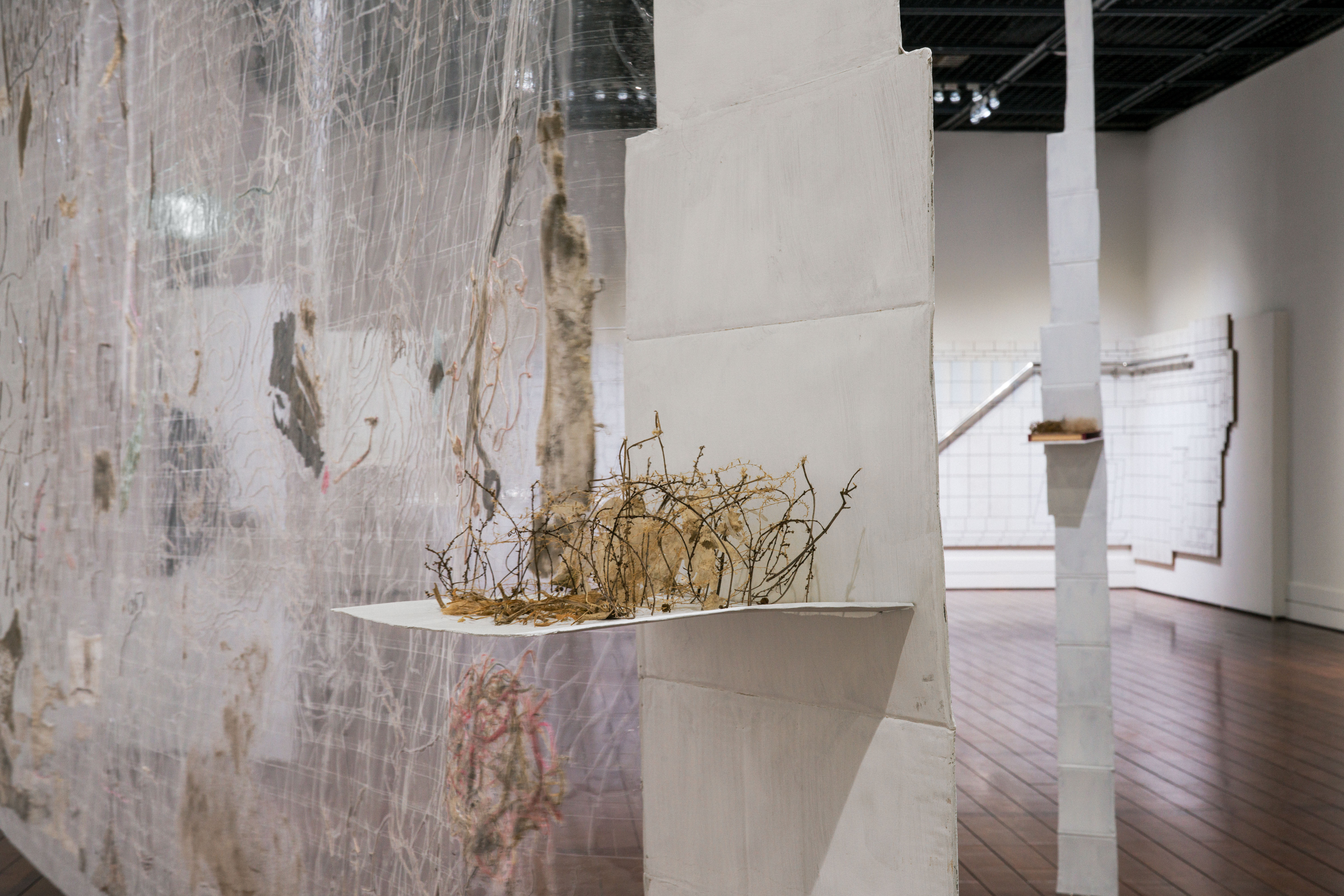 當藝術家在樹下撿拾鳥巢時,連結到曾凝視一幢由纖細鐵窗構成的環形大樓的記憶,亦回想當地人稱這些建築外觀如鳥籠,和這些建築跳樓自殺的事件。拆解具有墜落的意象的鳥巢再組成一個房間,如同將廢墟再造另一廢墟。《羽毛是樹231》的鳥巢裡包含蠅蛹、蛇皮、塑膠或鐵絲,而重組過後的房間表現出具有墜落空巢的特質。
