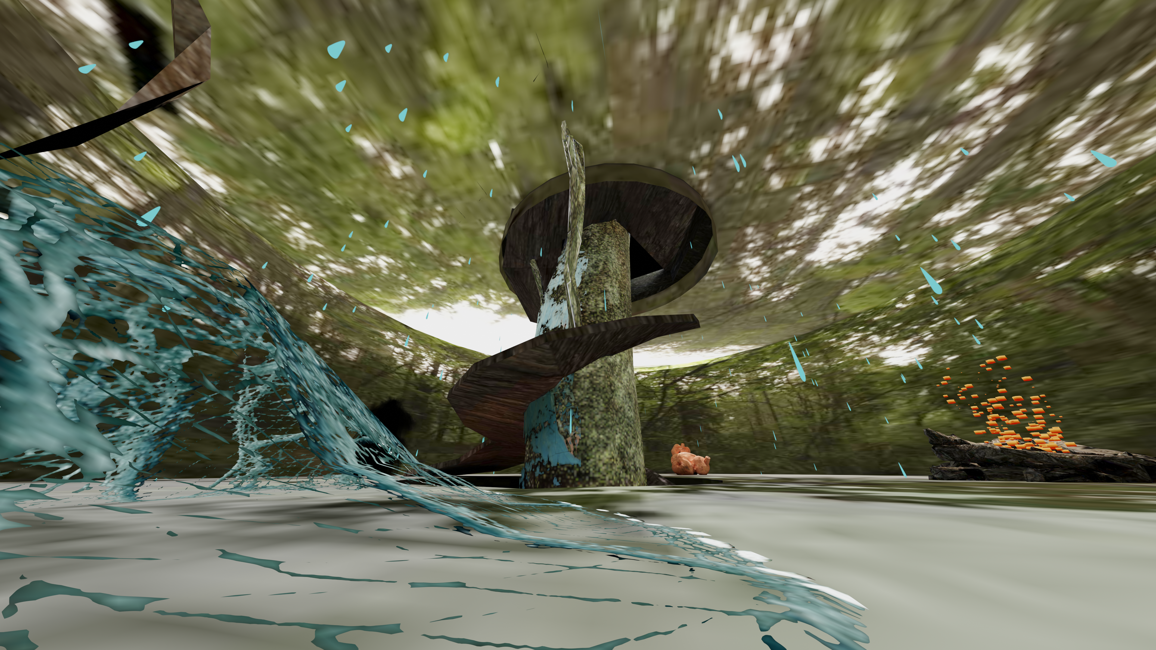 「洪水退去,大蛇、山蛙、蜥蜴與烏龜想要成為人,於是走向了山頂,那未知且閃耀著光芒的神靈故事,如鏡面般引領著人和靈之間的道路。混血人唱著歌,歌聲中混雜著呢喃和遷徙的記憶。山的內部劃出神話的空間,身體重返了神聖的山徑。」