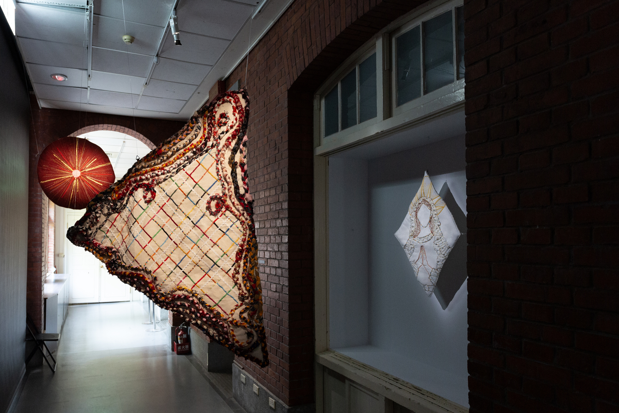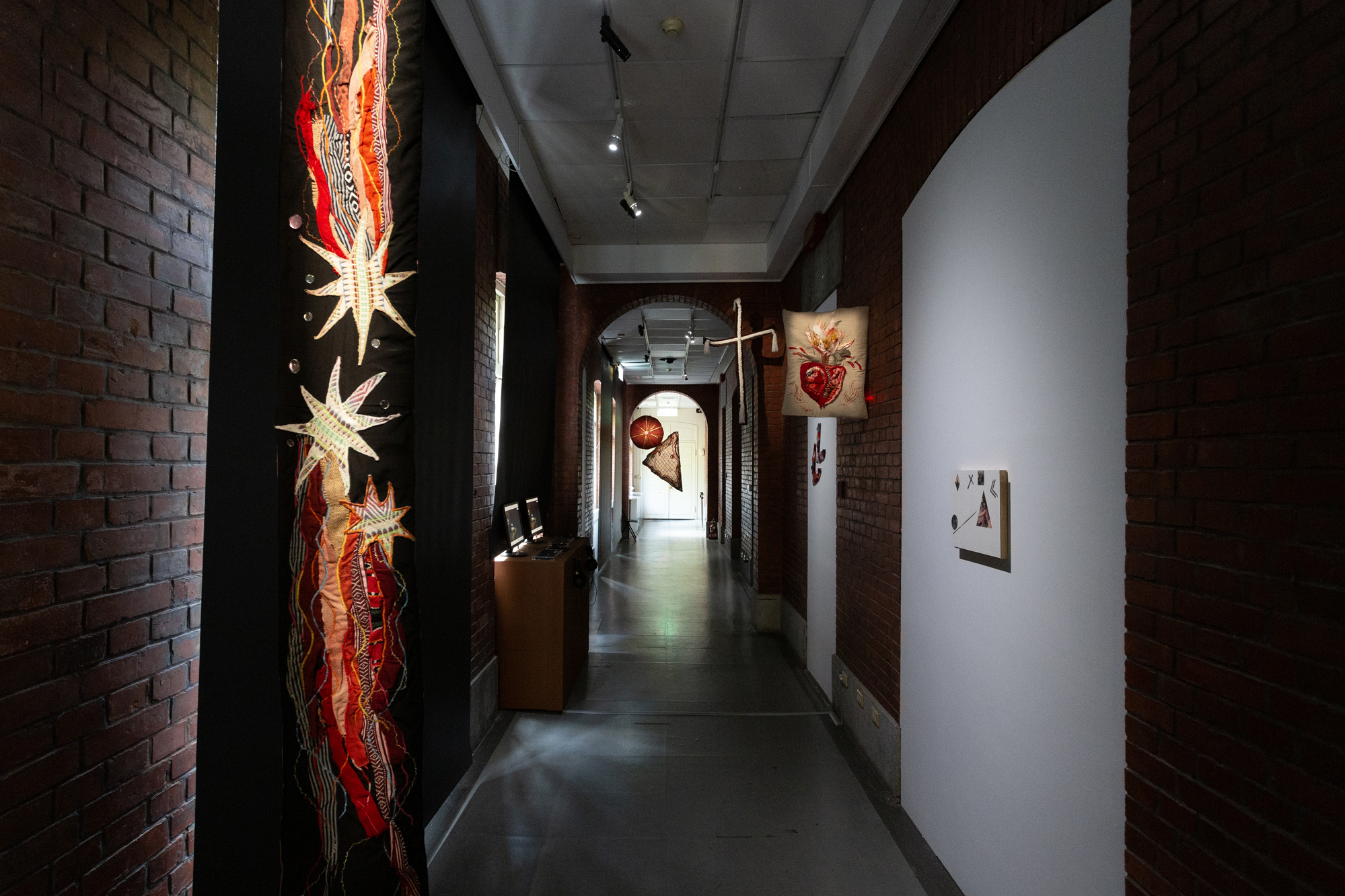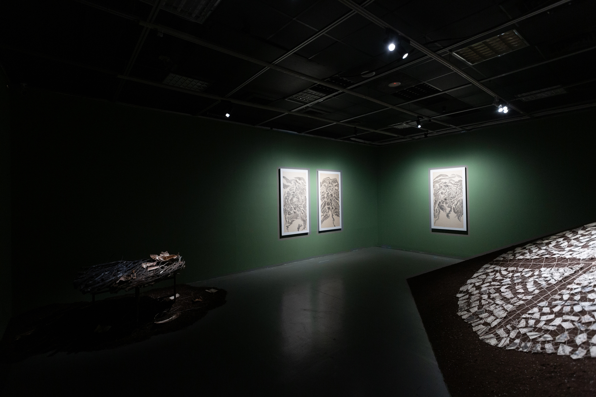 展覽邀請了六位藝術家共同參與,其中王愛眉的《一方安身之所》源自胡台麗教授紀錄片中,對於太巴塱祖屋(kakita’an)樑柱文化歸屬的提問。來自藝術家有感於一則事件,即太巴塱部落曾請求中央研究院,將七根雕刻柱歸還給部落。最終妥協的辦法是,把留在這些柱子裡的祖靈帶回村落,但是木柱仍留在博物館中。《一方安身之所》曾於二〇二〇年的展覽「混血人:來一場野性的餐會」展示,過去的版本透過破碎、解構和重組樑柱的圖像製成陶片,讓觀眾們可以將陶片歸還給自然,進而讓柱子的碎片繁衍和解放。而在這次延伸出的作品《地臍》,從分散的碎片匯聚在同個地方,曾被帶到各處的碎片連結成一張網。這張網的意象在藝術家的腦海中不斷地變化,從部落族人使用的八卦網到登山的繩索;山徑到連結到部落的路線,將人和這片土地連接在一起。網子在保護祖屋結構的柱子碎片同時,也成為另一種文化的網,如同保護土壤免受自然災害的影響,也保護了將被遺忘且日漸稀薄的記憶。