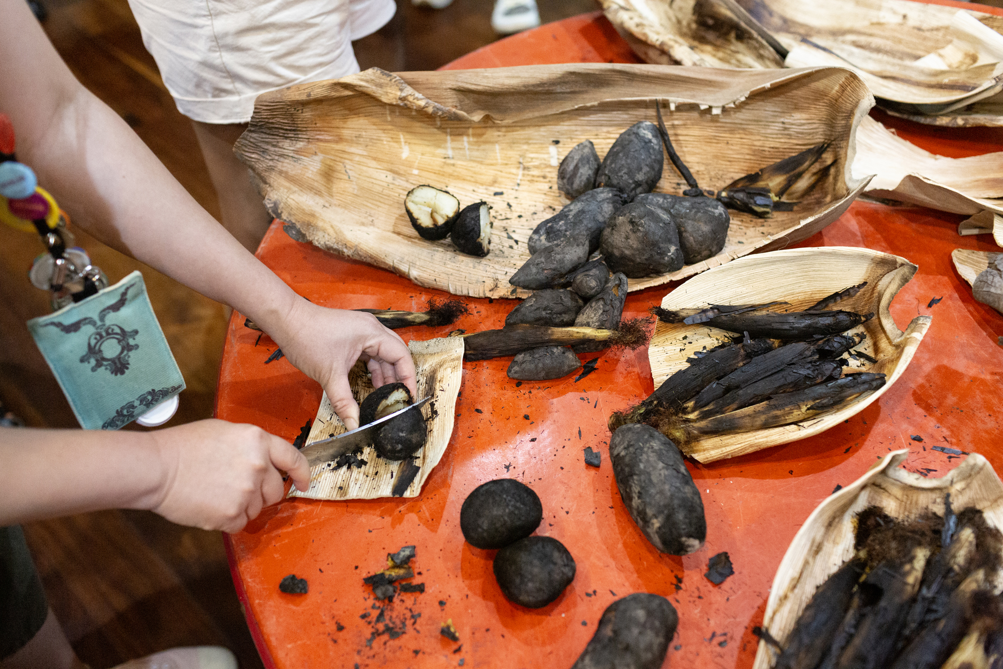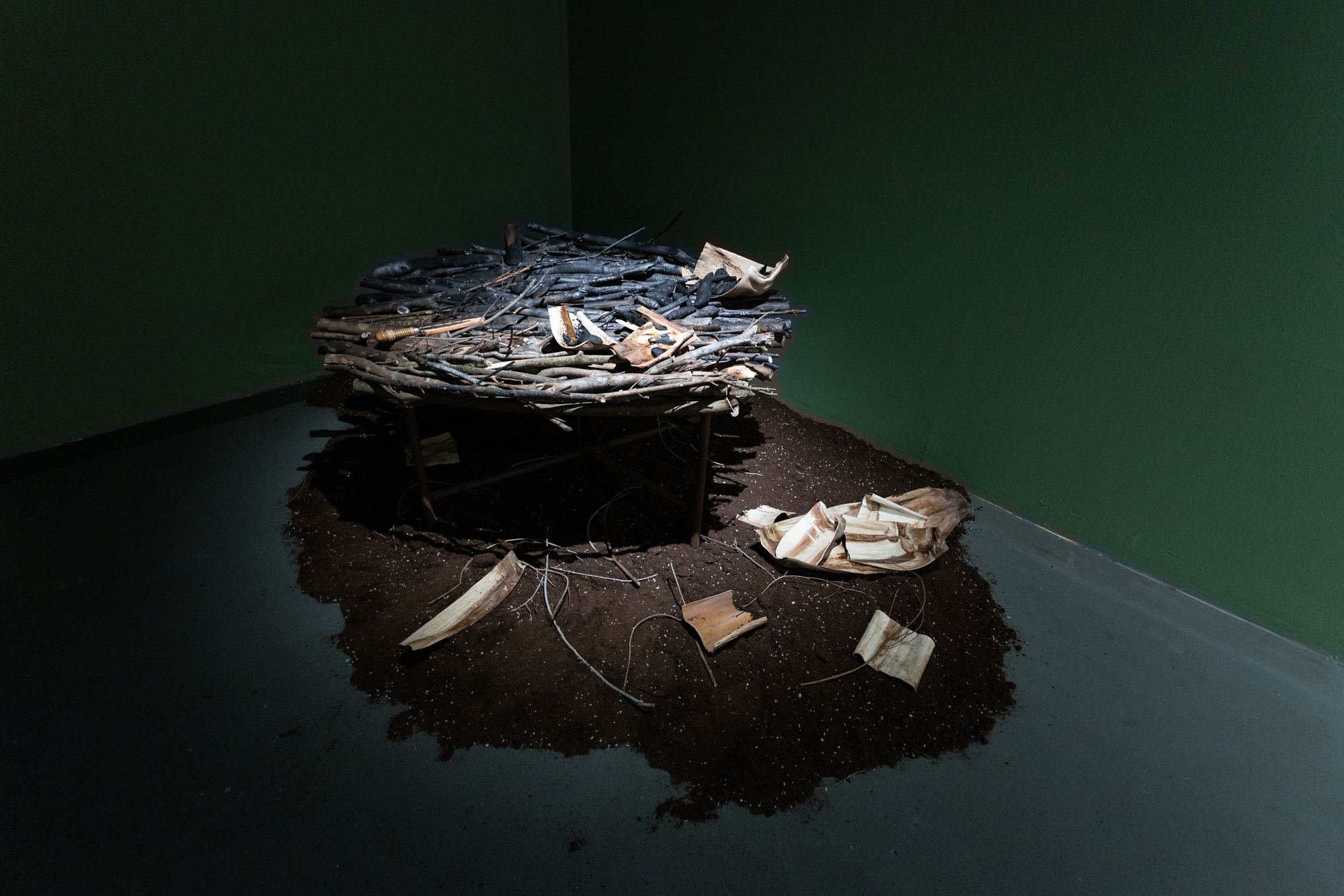 羅聿綺經由駐留在部落的生活經驗出發,作品《吞吐,然然,炭色的黑》包含展期間的共享餐會和遺留在展場的食物雕塑,經由碳燒後難以辨識的外觀,延伸在部落烤火過程中所產生不同層次的「黑」的想像,如焦黑、炭黑、燻黑。藝術家提出,被碳燒的木頭從身長在山林間的樹木,到堆放於家院裡的木柴,最後在火堆裡燃燒殆盡。每一塊木頭皆承載著記憶,回應著人、物、地之間的關係。透過「烤火」承載著不同的生命痕跡,它可以成就了一鍋湯,燻烤了一批醃肉,暖和了凍著的身體,燒盡了圍聚時的食物垃圾或剩餘物,或是開啟一晚的閒話家常。