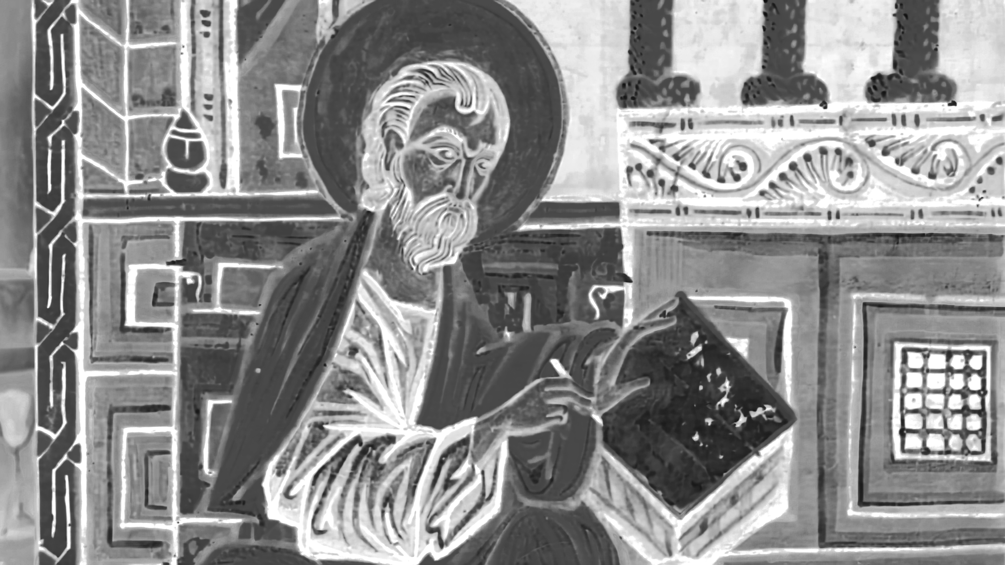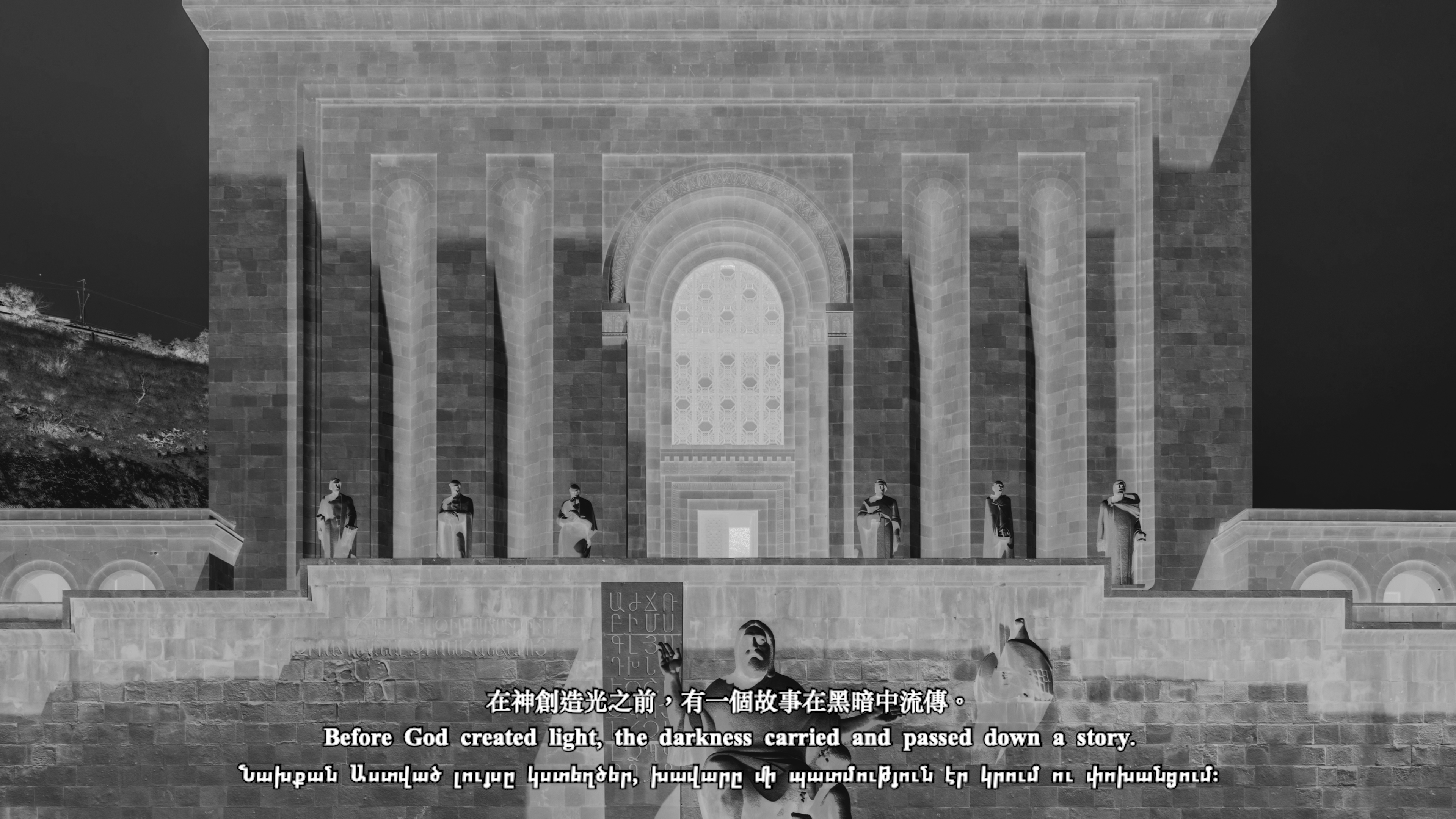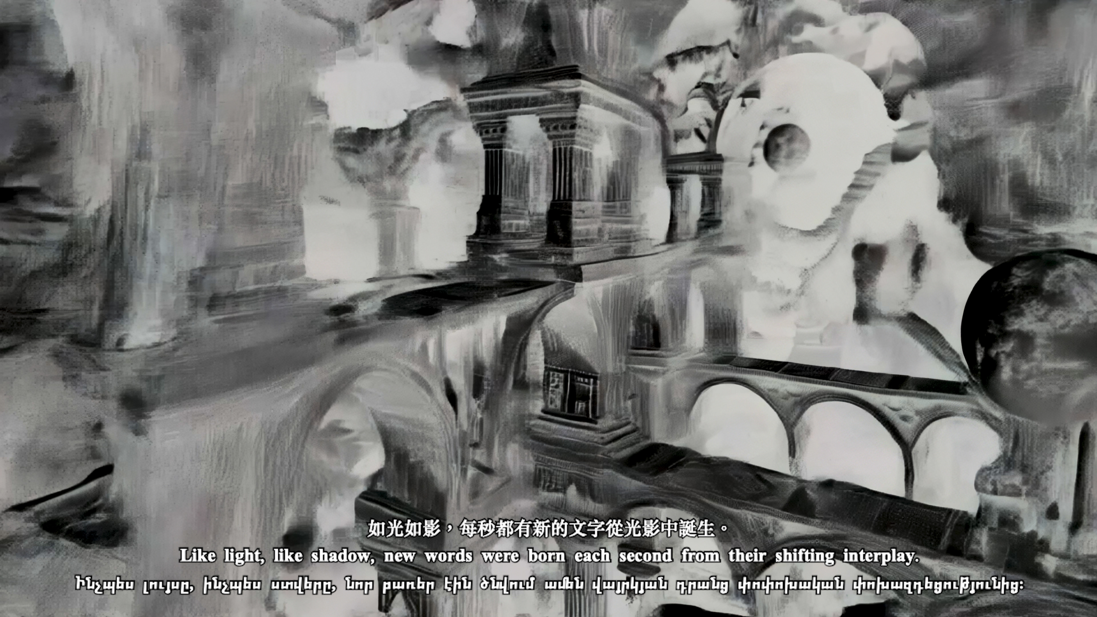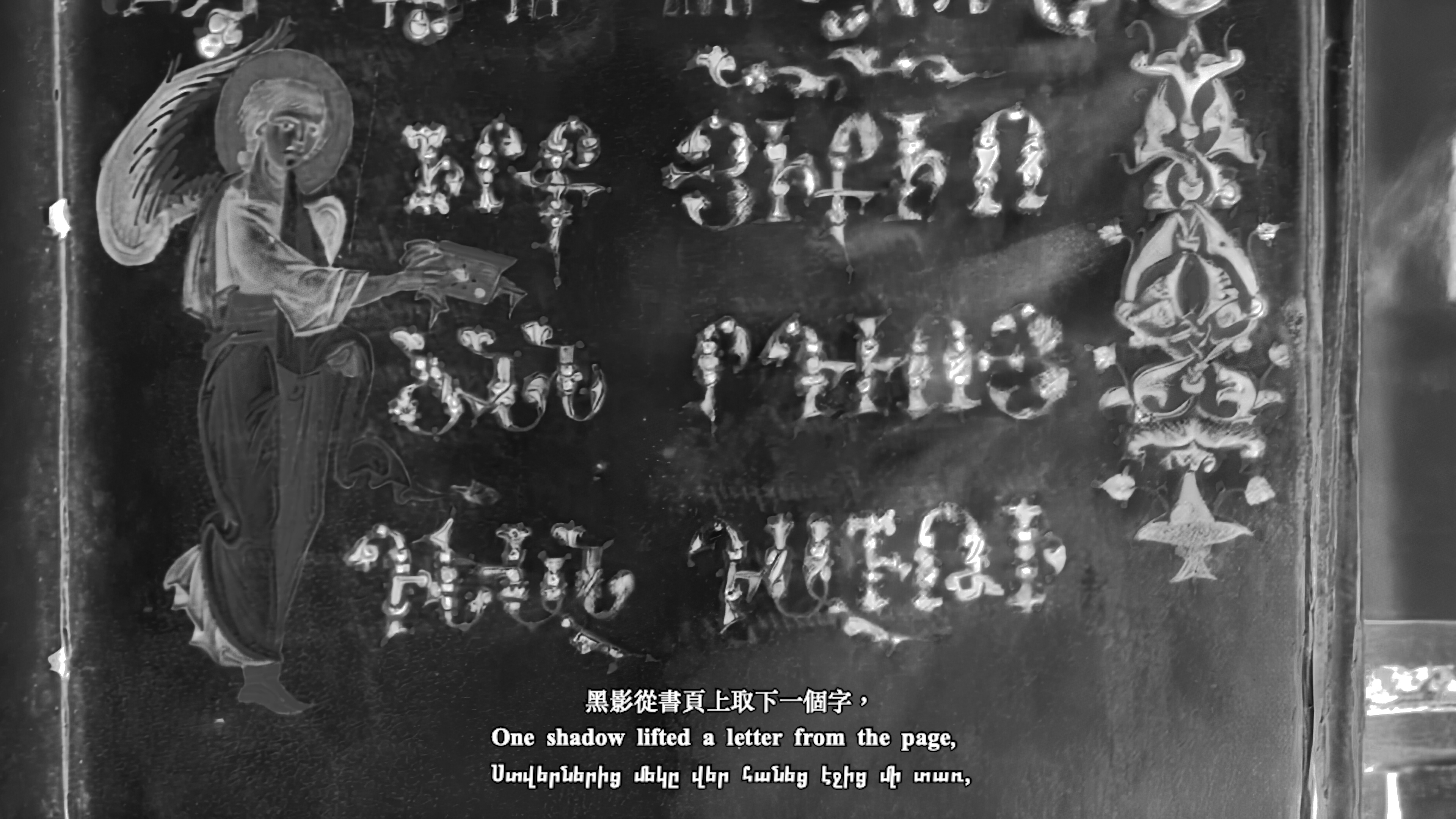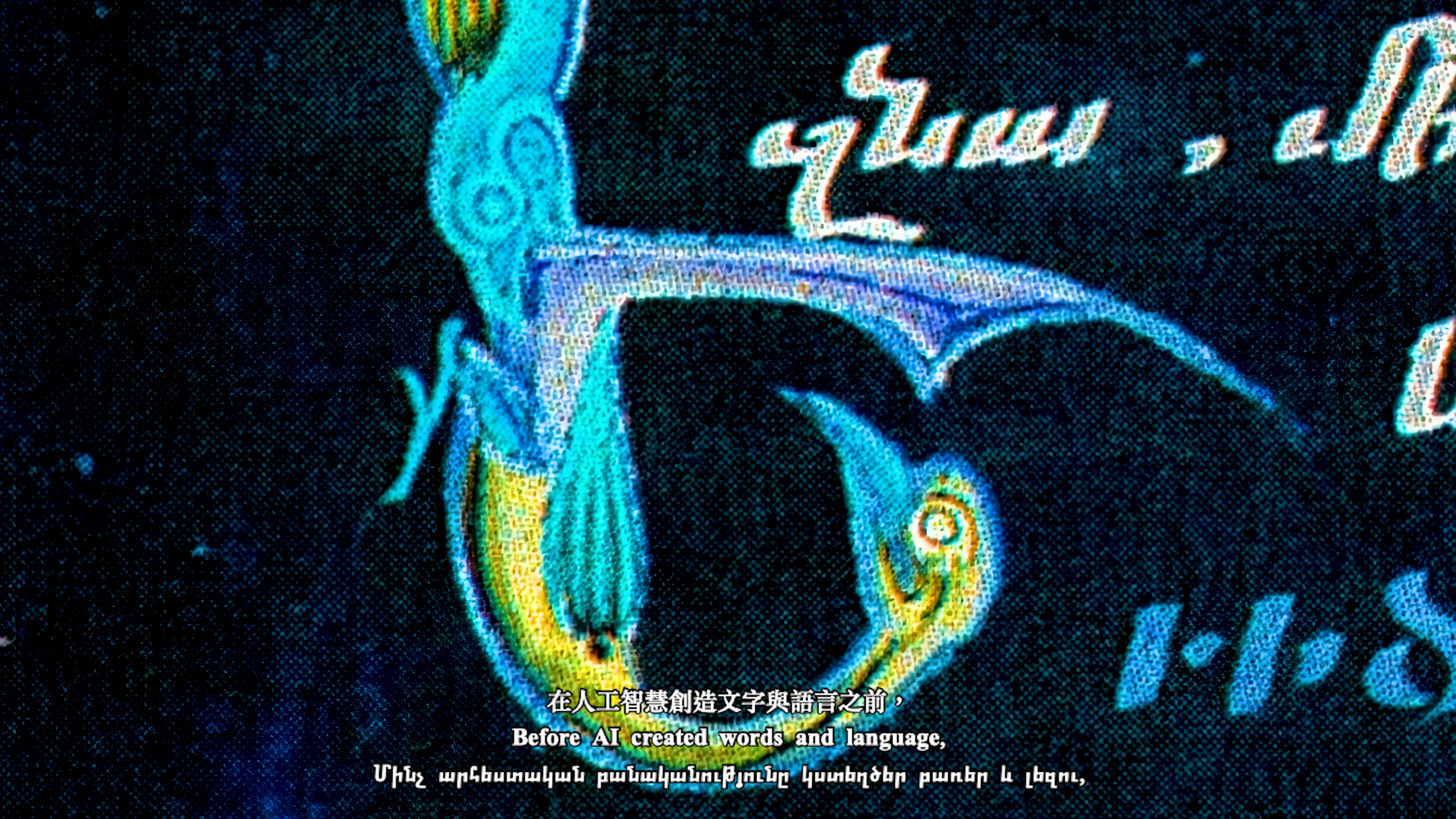 《盜字者》是一件結合生成式人工智慧、實景拍攝和中世紀手抄本的錄像作品。以亞美尼亞手抄本博物館(Matenadaran)的典藏品為基礎,作品通過生成式 AI 重新詮釋中世紀的《舊約聖經》和《福音書》等手抄本,並虛構一部關於人工智慧的語言神話。