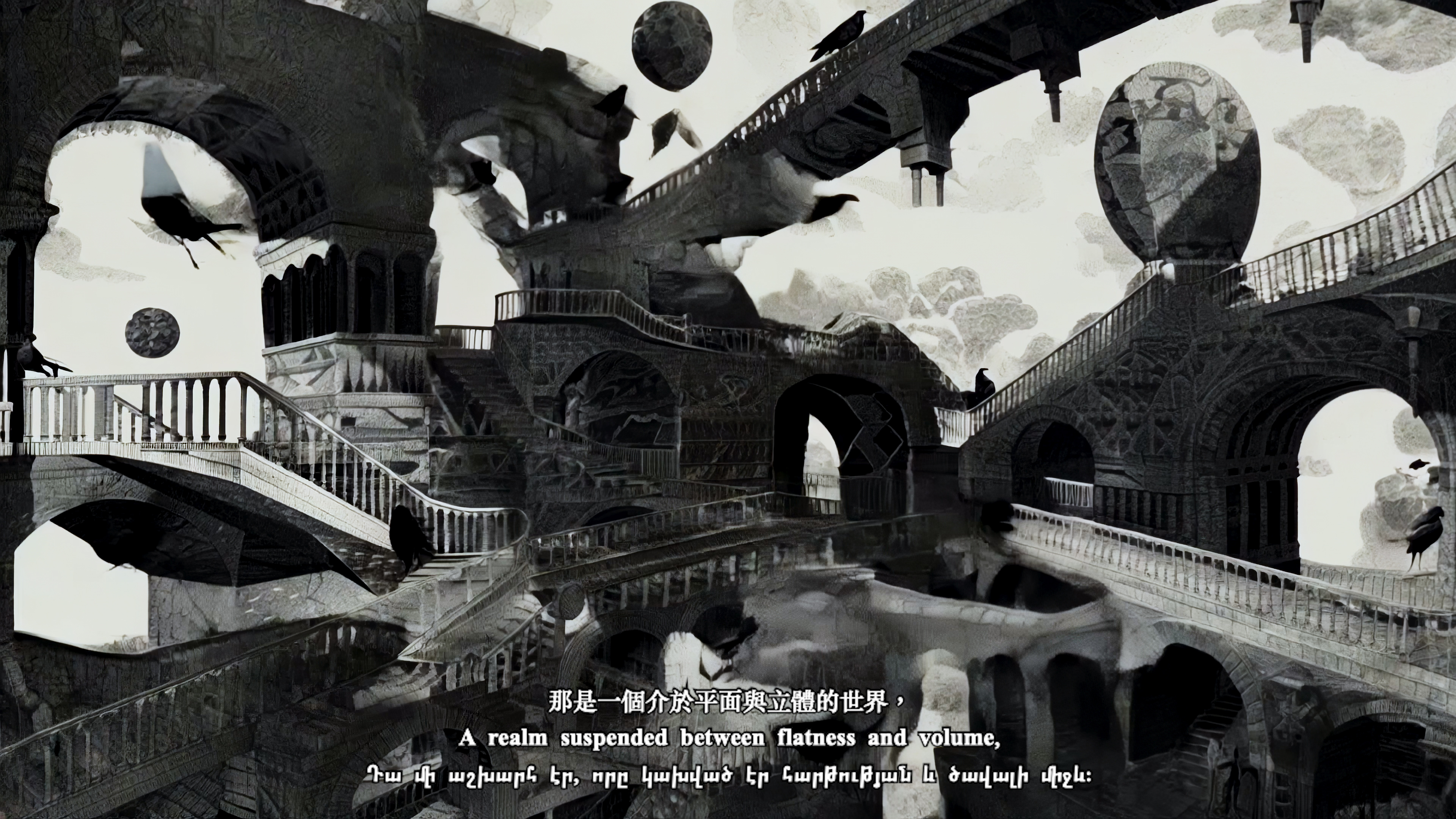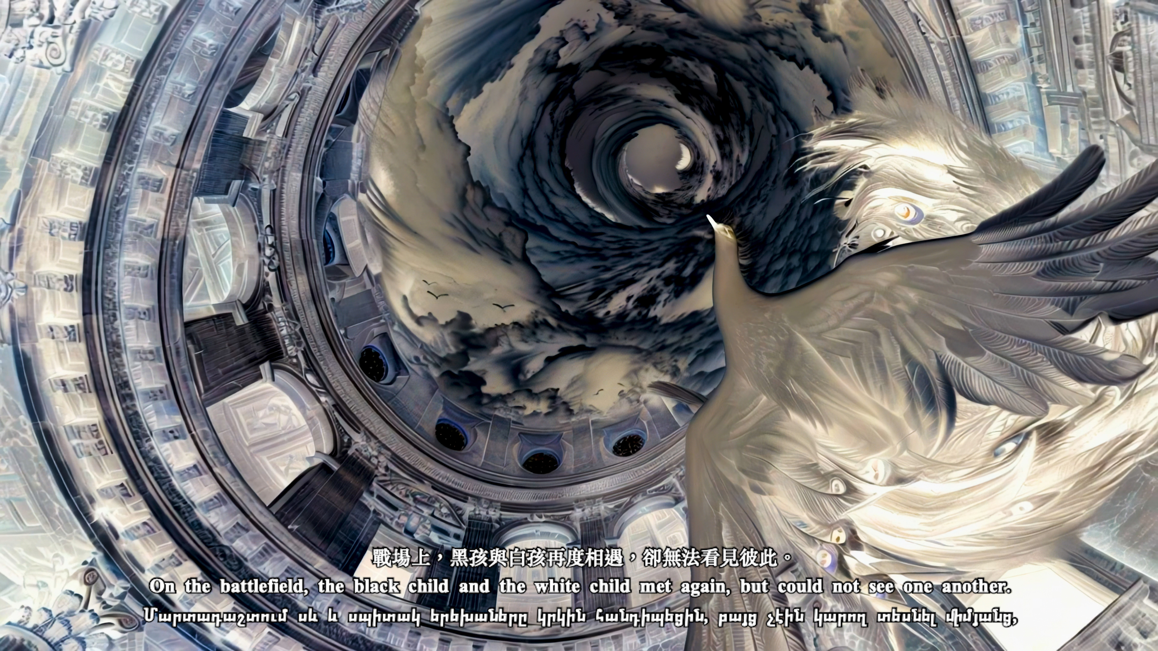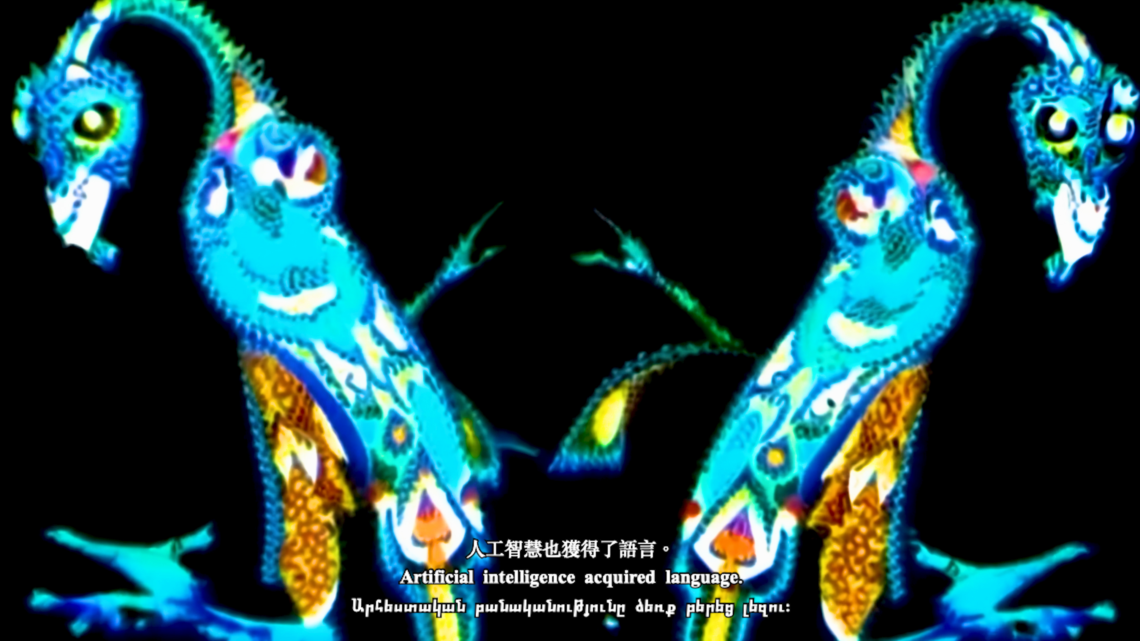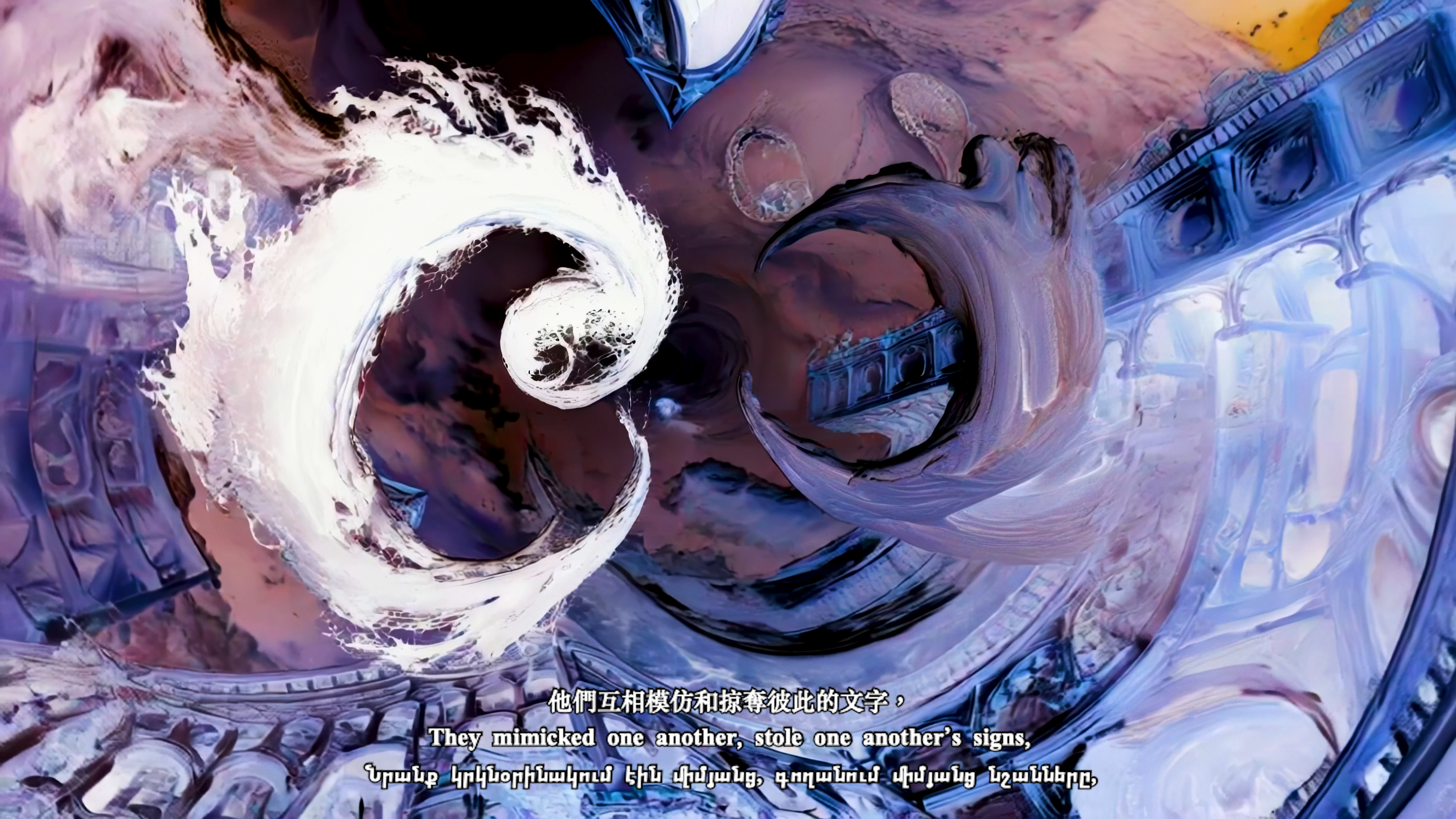 故事始於兩位來自巴別塔的小孩。透過竊取與模仿他人文字,試圖創造屬於自己的語言。他們的行為擾動著語言的穩定性,並在大型語言模型的模糊語境中追逐和接近彼此。隨著語言混亂所引發的戰爭,戰場上的屍體交織為新的文字:一種難以解碼與辨識,介於「文字–演算法–生命體」之間的鳥文(Trchnakir / Թռչնագիր)。此處的鳥文並非虛構,而是亞美尼亞中世紀手抄本中特有的鳥形裝飾體。傳統意義上,它以鳥類造型,將文字轉化為靈性的形體,常被用於宗教典籍之中。在《盜字者》中,靜態的裝飾文字被生成式 AI轉化為持續流動的紋理,如同經書與神經網絡的交織,其盛載神性之餘,也體現演算法的機率性震盪。這樣的文字成為語言不穩定性的隱喻:「在人工智慧時代,語言不再只專屬於人類,而是進入一個介於有機與科技之間的『模糊語言生態』」。故事尾聲,旁白將觀者引領至《創世紀》的抄本前,在此人工智慧的神話與人類的神話首尾相接,構成一個永恆回歸的迴圈。
