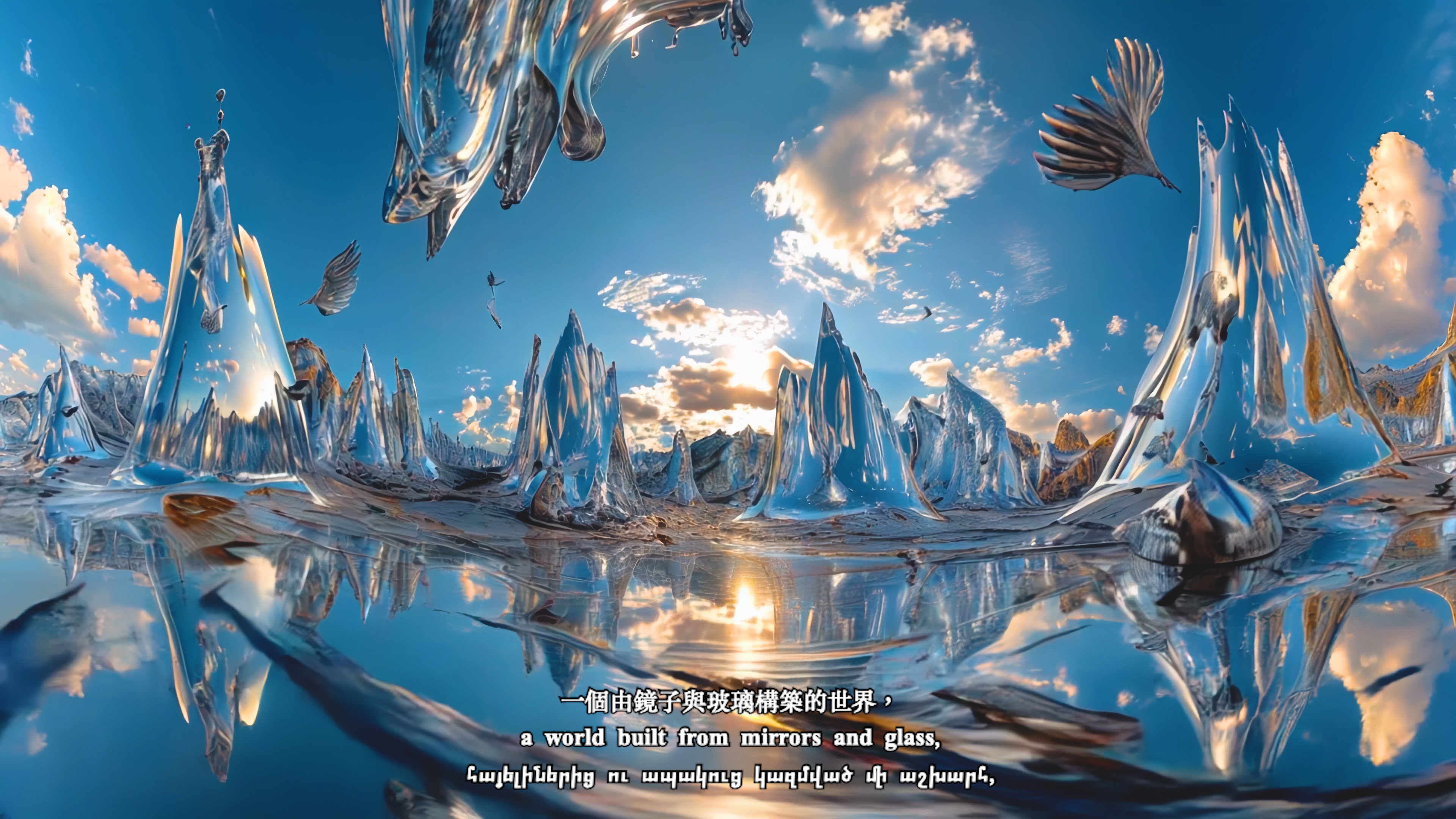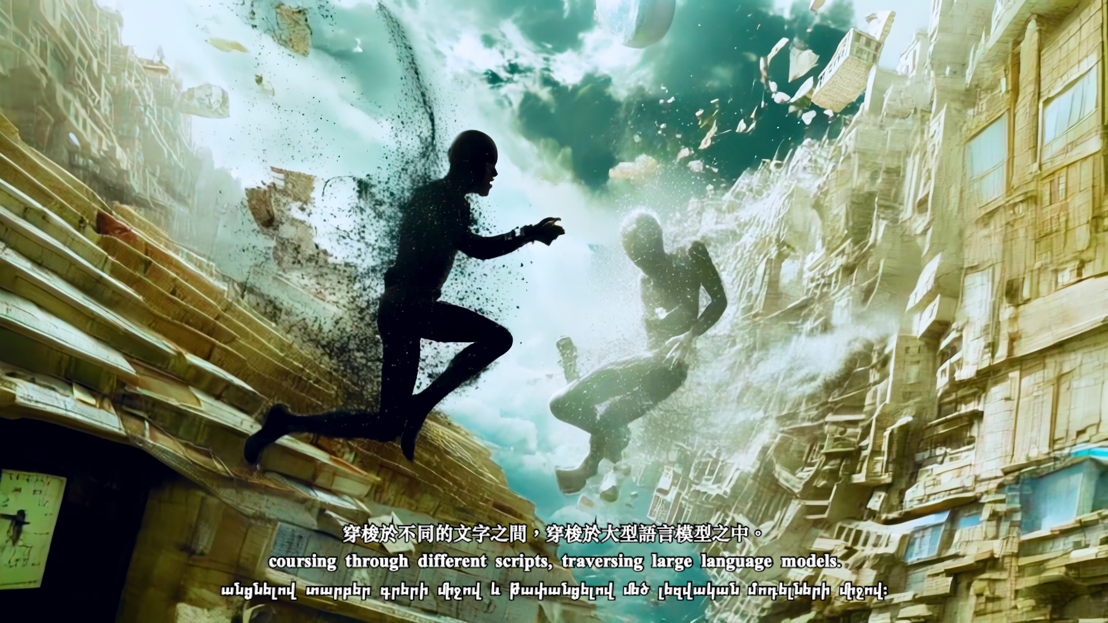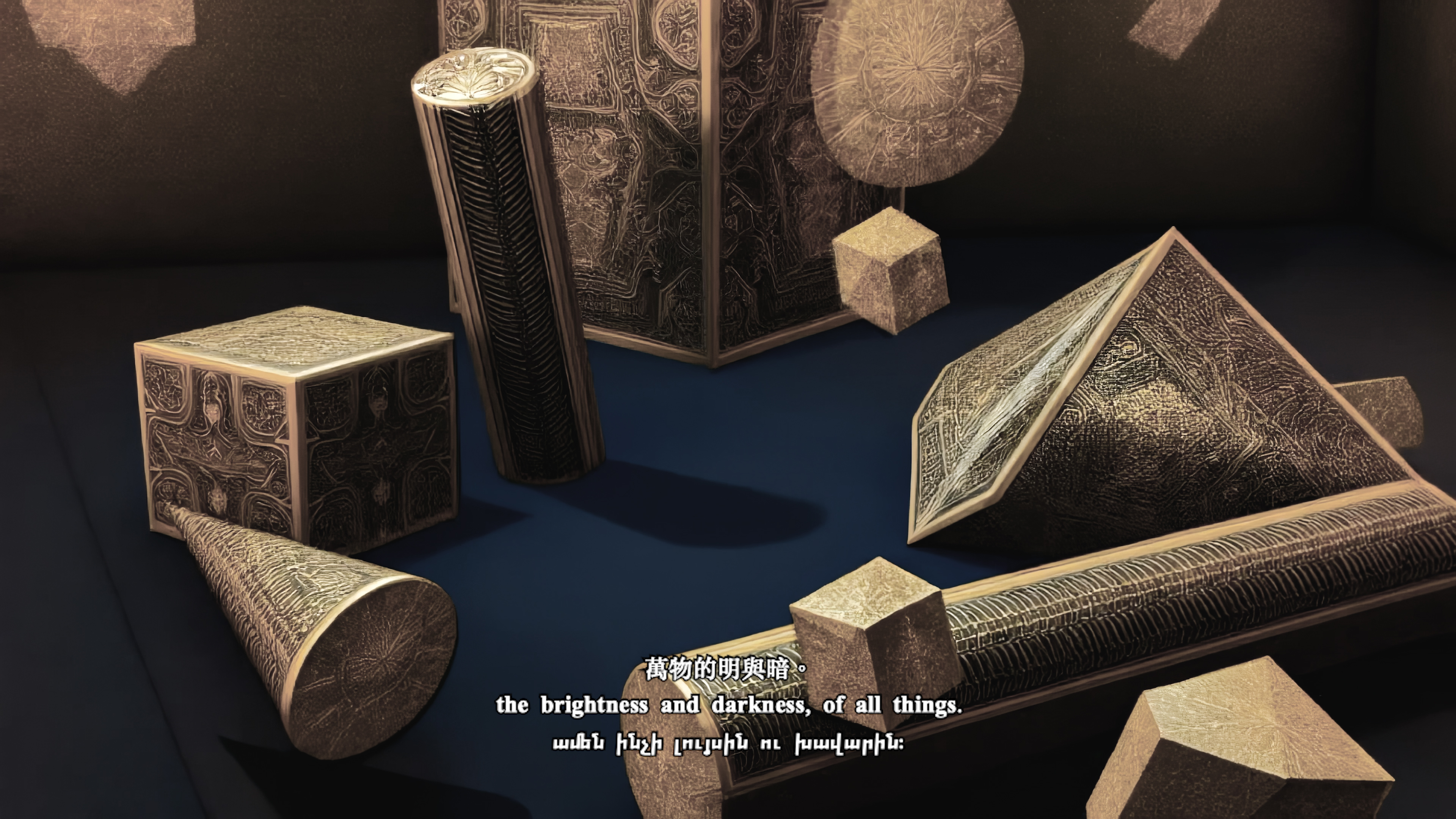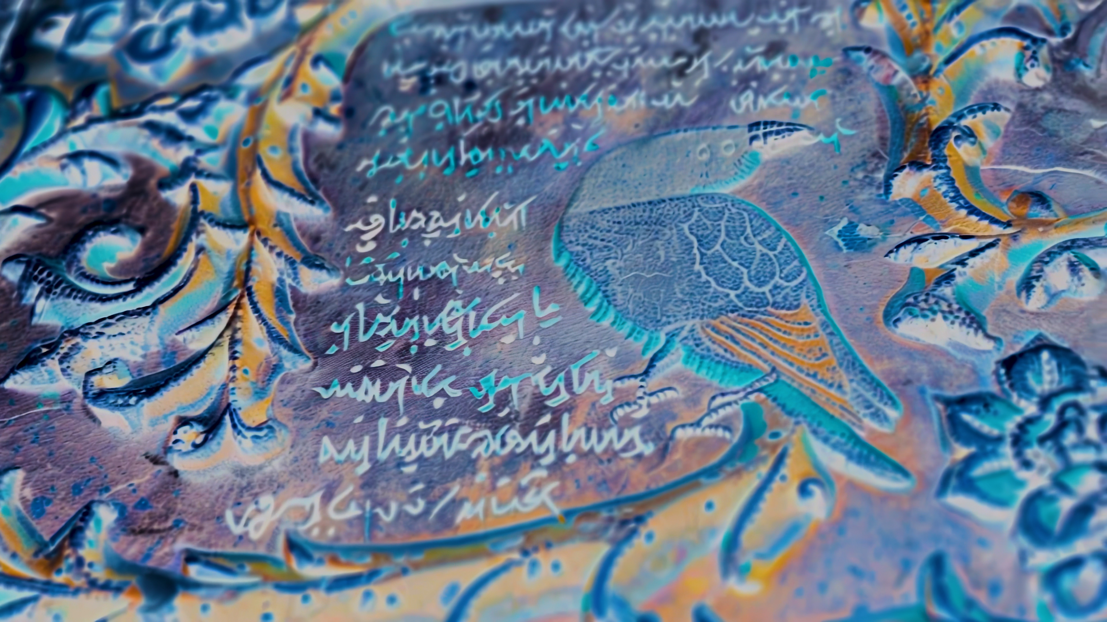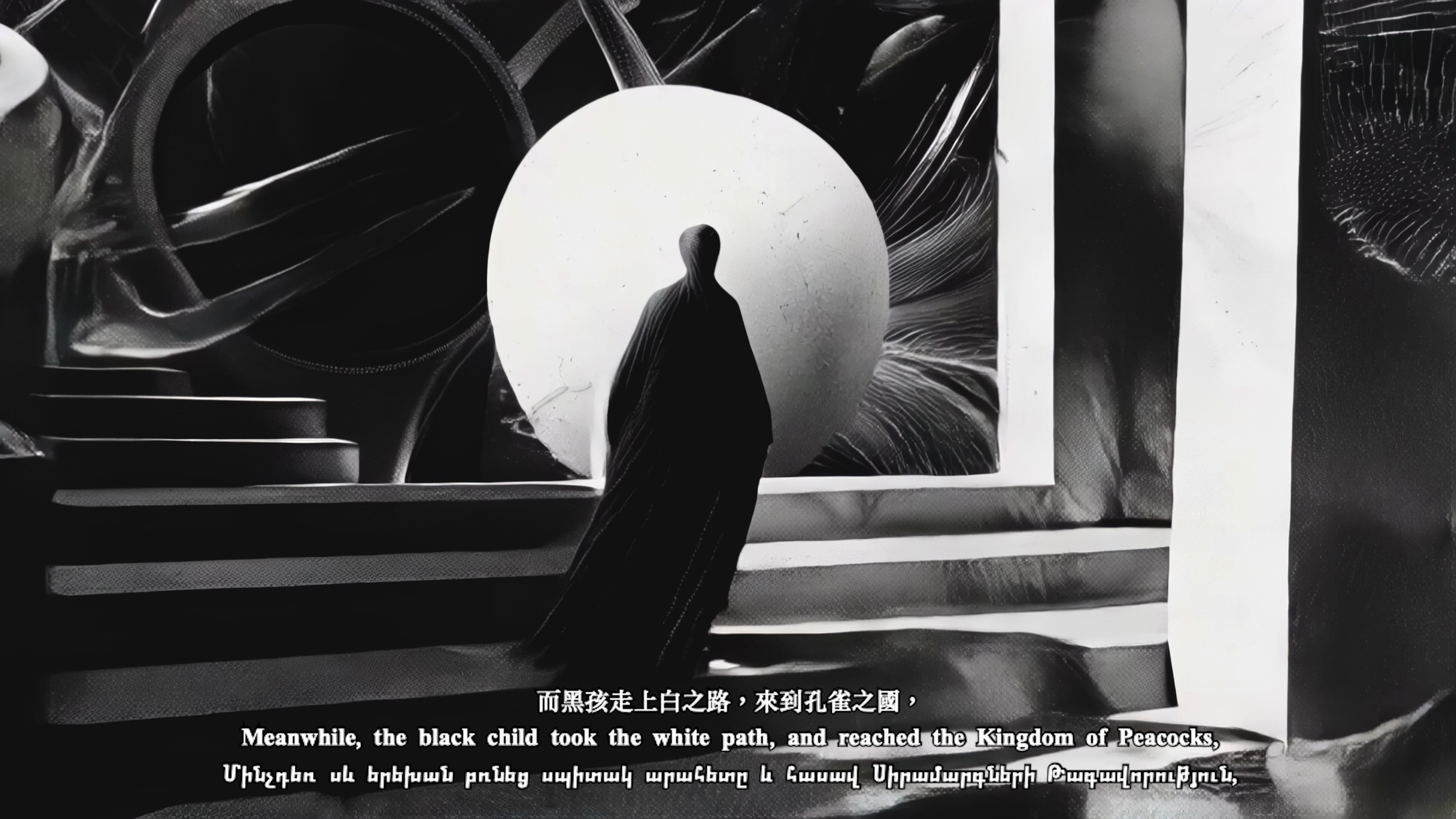 故事始於兩位來自巴別塔的小孩。透過竊取與模仿他人文字,試圖創造屬於自己的語言。他們的行為擾動著語言的穩定性,並在大型語言模型的模糊語境中追逐和接近彼此。隨著語言混亂所引發的戰爭,戰場上的屍體交織為新的文字:一種難以解碼與辨識,介於「文字–演算法–生命體」之間的鳥文(Trchnakir / Թռչնագիր)。此處的鳥文並非虛構,而是亞美尼亞中世紀手抄本中特有的鳥形裝飾體。傳統意義上,它以鳥類造型,將文字轉化為靈性的形體,常被用於宗教典籍之中。在《盜字者》中,靜態的裝飾文字被生成式 AI轉化為持續流動的紋理,如同經書與神經網絡的交織,其盛載神性之餘,也體現演算法的機率性震盪。這樣的文字成為語言不穩定性的隱喻:「在人工智慧時代,語言不再只專屬於人類,而是進入一個介於有機與科技之間的『模糊語言生態』」。故事尾聲,旁白將觀者引領至《創世紀》的抄本前,在此人工智慧的神話與人類的神話首尾相接,構成一個永恆回歸的迴圈。